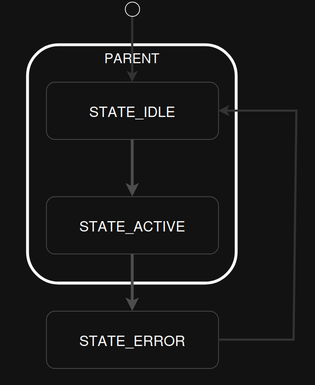 The example below turns the following state diagram into code using SMF, where IDLE and ACTIVE share a parent