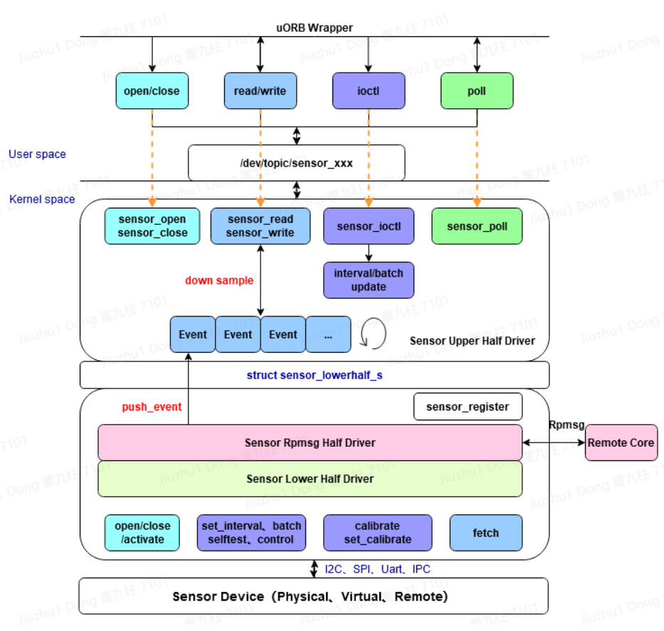 NuttX, in order to uniformly manage all sensors, reuse common code, and reduce space occupation, extracts the common parts of all sensor drivers into an upper half layer that provides general functionalities. The lower half layer is responsible for the actual interaction with sensor registers.